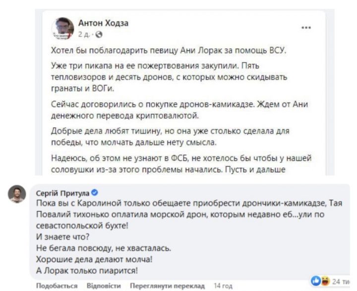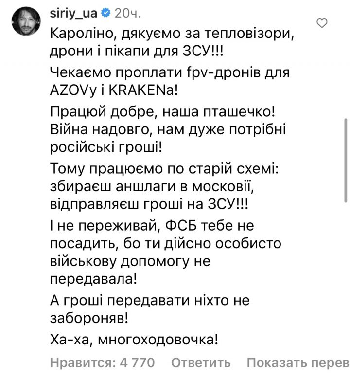 Однак, Сергій Притула був не серед них. Натомість чоловік потішив своїх підписників абсолютно іншою реакцією на поведінку артистки. Не так давно Ані Лорак оприлюднила на особистій сторінці в соціальній мережі Instagram звернення, в якому розповіла, що ніколи не підтримувала війни, але при цьому ніяким чином не сприяла перемозі одній зі сторін. Під публікацією Сергій Притула подякував Кароліні за її “грошову допомогу ЗСУ”.