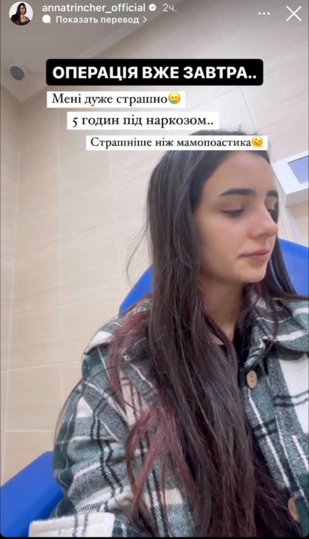 «Операція вже завтра (21 квітня – прим. ред.)… Мені дуже страшно. П’ять годин під наркозом. Страшніше, ніж мамопластика», — поділилася знаменитість.