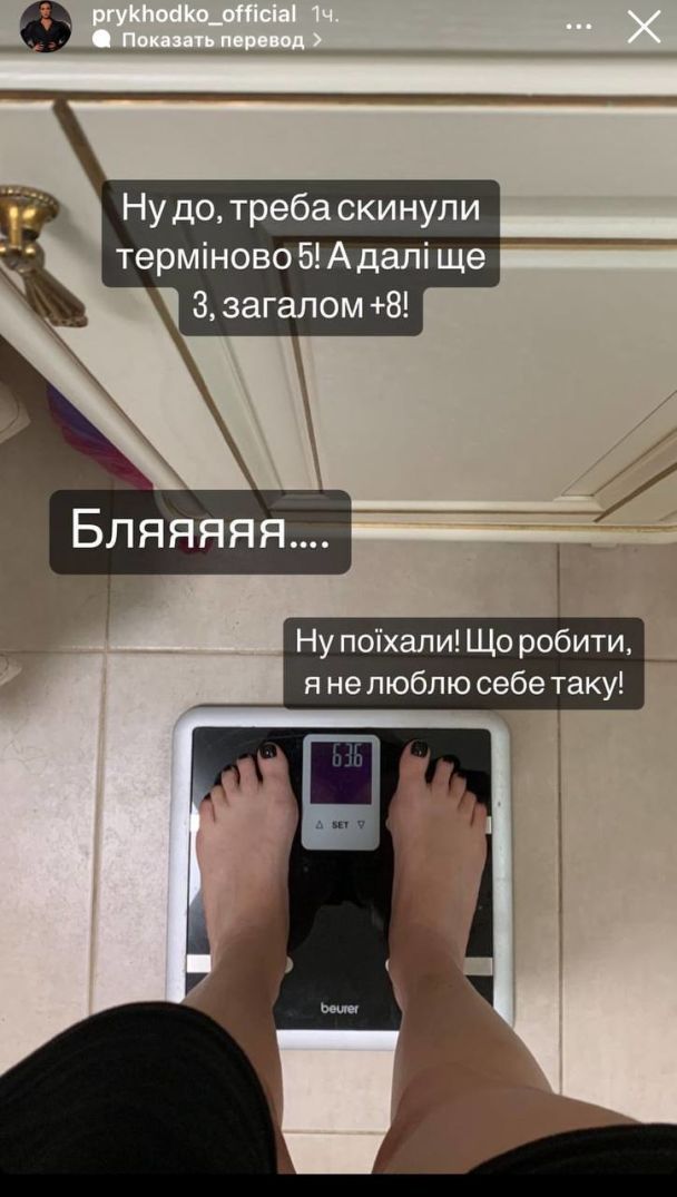 Однак коли виконавиця стала на ваги, то змінила свою думку. Приходько нині важить 63,6 кіло. Виконавиця переконана, що загалом їй треба скинути вісім зайвих кіло, адже поки що вона собі не подобається.