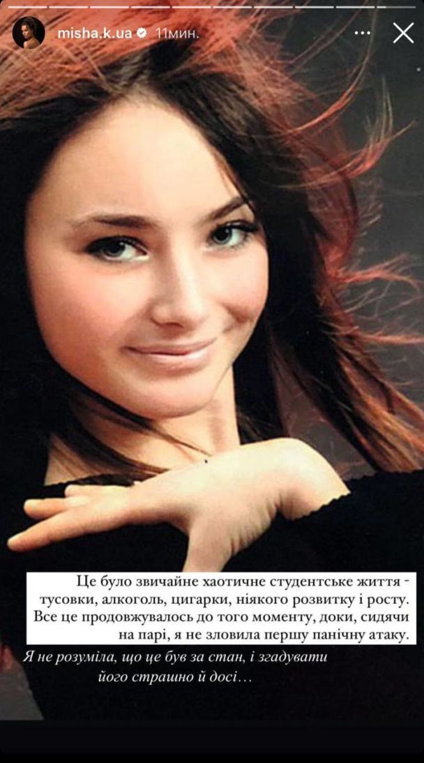 «Це було звичайне хаотичне студентське життя – тусовки, алкоголь, цигарки, жодного розвитку і росту. Все це продовжувалося до тієї миті, доки, сидячи на парі, я не зловила першу панічну атаку. Я не розуміла, що це був за стан, і згадувати страшно й досі…», — поділилася Ксенія.