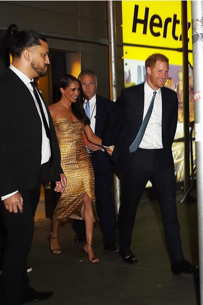 Для заходу Маркл обрала золоту сукню з відкритими плечима за 1850 доларів. Вечірній образ зірки доповнили браслети з діамантами, вартість яких склала в цілому 7350 доларів.