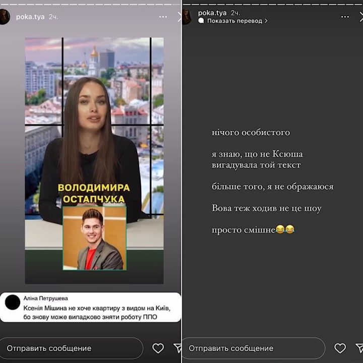 «Нічого особистого. Я знаю, що це не Ксенія вигадувала той текст. Більше того, я не ображаюся. Вова теж ходив на це шоу. Просто смішне», — прокоментувала Катя.