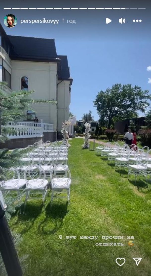 Весілля відбувається під відкритим небом. Територія резиденції прикрашена білими трояндами.
