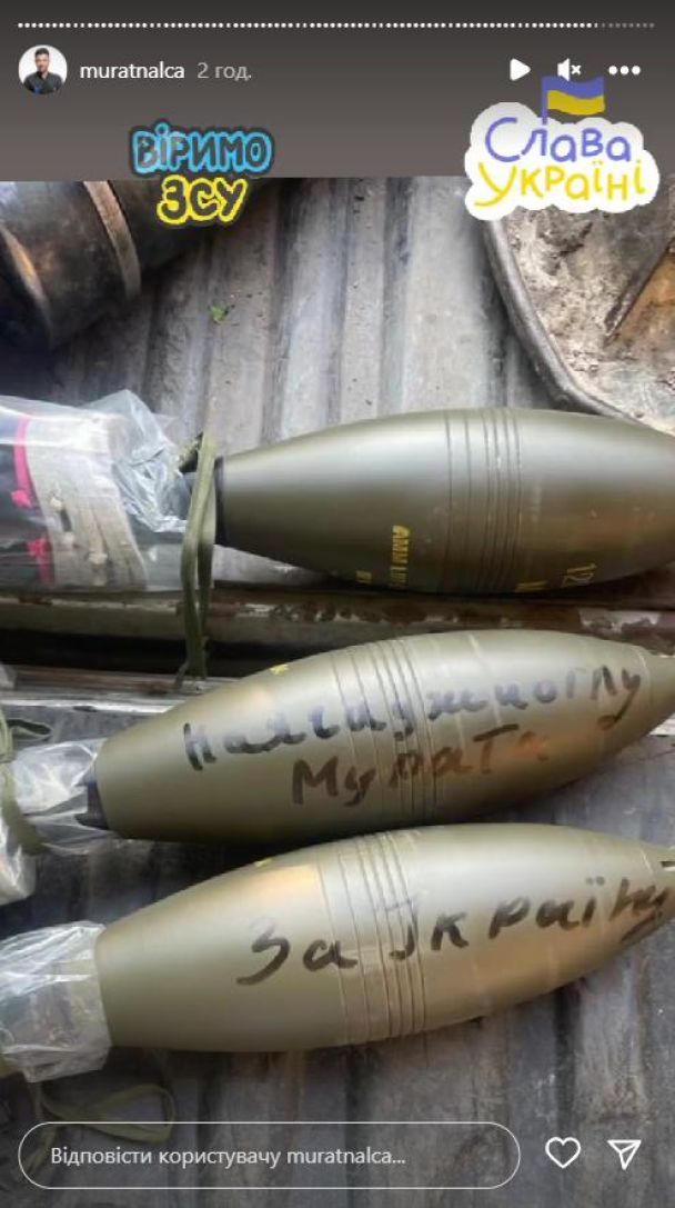 Окрім того, Мурат поділився, що не так давно передав «подарунок» російським окупантам. У сторіз своєї сторінки в Instagram бізнесмен розмістив фото, на якому зображені боєприпаси, на яких Мурат написав: «Мурат Налчаджиоглу, за Україну». бізнесмен взяв участь в ініціативі Укроборонпрому, в рамках якої музиканти, військові та громадські діячі залишають на новеньких боєприпасах послання своїм ворогам.
