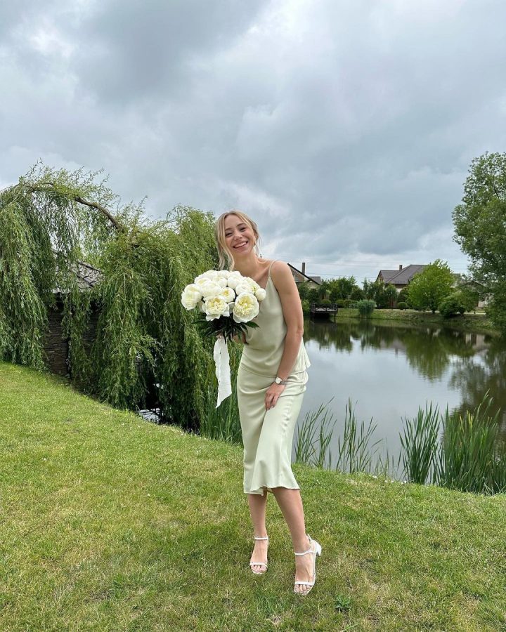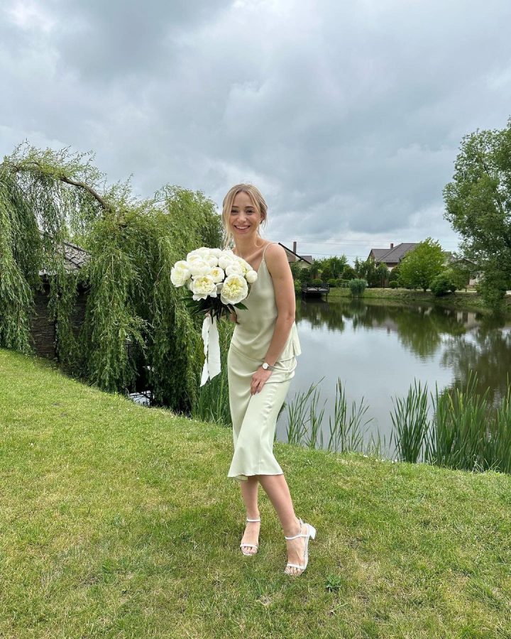 Для святкування блогерка обрала тендітний образ — легку сукню у більйовому стилі на тонких бретельках та білі босоніжки. Вбрання Катерина доповнила зібраною зачіскою з випущеними спереду локонами та легким макіяжем. А на світлинах дружина Павліка позувала з ніжним букетом білих півоній.