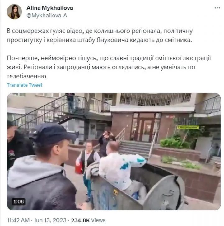 «У соцмережах гуляє відео, де колишнього регіонала, політичну повію і керівника штабу Януковича кидають у смітник. По-перше, неймовірно рада, що славні традиції сміттєвої люстрації живі. Регіонали і зрадники повинні оглядатися, а не «умнічать» по телебаченню», — написала Анна Михайлова у своєму Twitter.