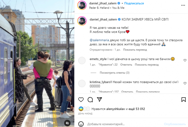 Зворушливим відео їхньої зустрічі на пероні вокзалу шоумен поділився на своїй сторінці в Instagram. Санта заскочила на руки до батька та міцно обіймала його, а сам Даніель не міг втримати щасливих емоцій. Також шоумен звернувся до дружини Марії та подякував їй за донечку.