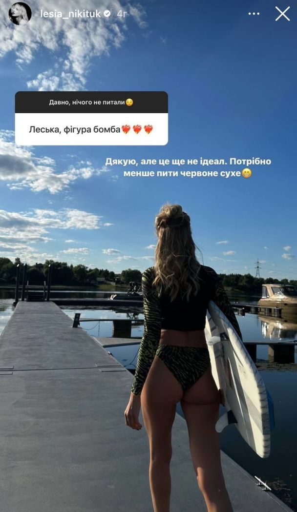 Однак фани звернули увагу не лише на Лесині успіхи у вейкбордингу. Прихильники зазначили, що у Нікітюк неабияк струнка фігура. Ведуча натомість опублікувала фото, де посвітила апетитними сідницями у купальнику. Щоправда, знаменитість зауважила, що поки у неї не ідеальна фігура.