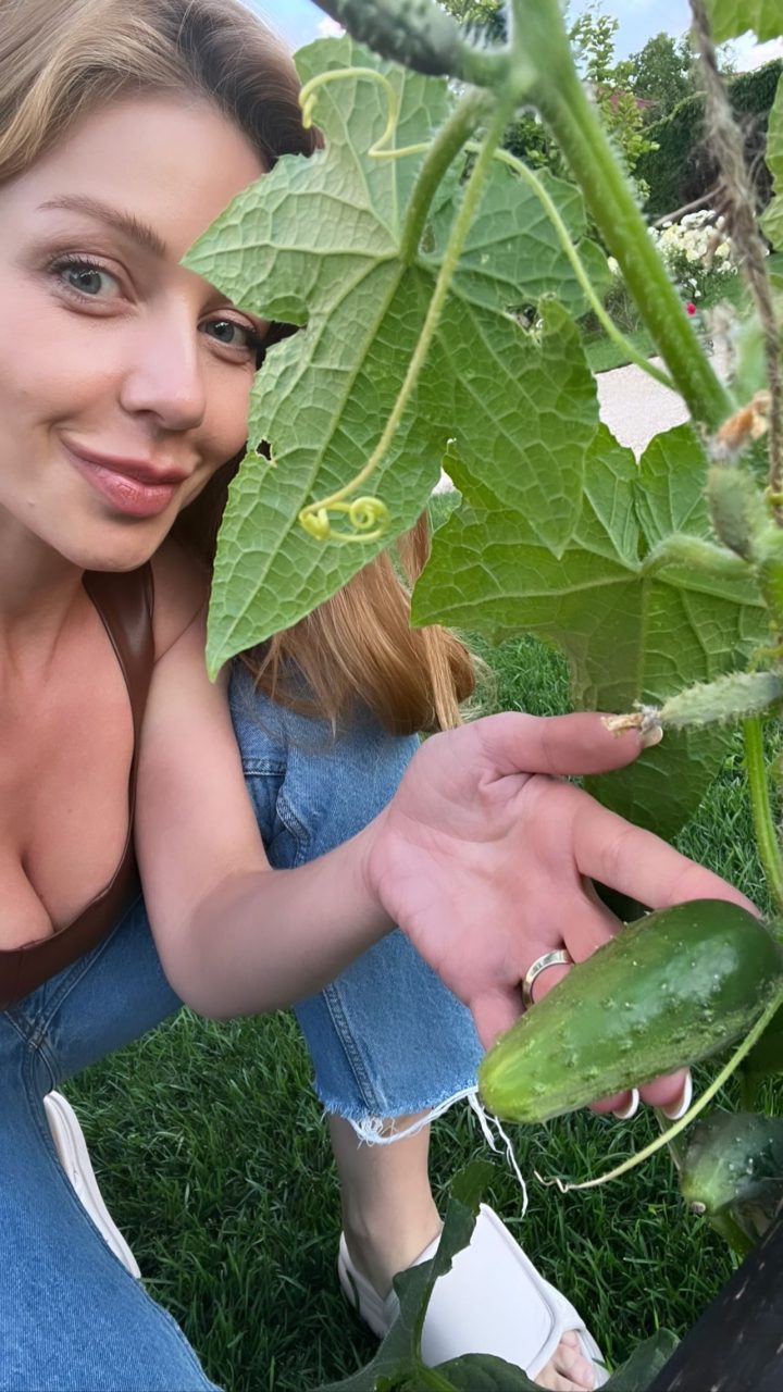 Як відомо, виконавиця має заміський будинок у селі Зазим’є на Київщині. У сторіз в Instagram Кароль похизувалася першим урожаєм із власного городу. Співачка без макіяжу та в домашньому вбранні поділилася радісним фото поруч із підрослими огірками.