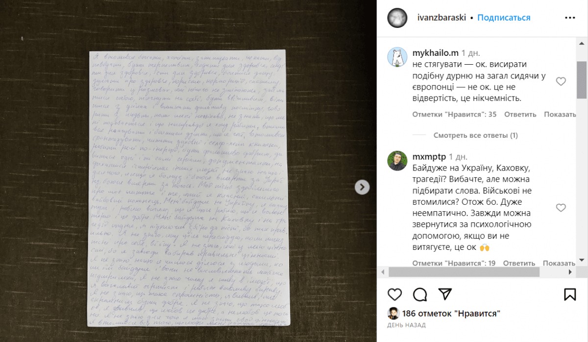 На своїй сторінці в Instagram він опублікував фотографію тексту, викладеного на папері. Збараський пише, що боїться померти за Україну і за людей. Також він говорить про те, що йому все одно на Каховку, хоча ще недавно випустив пісню, присвячену трагедії на Каховській ГЕС.