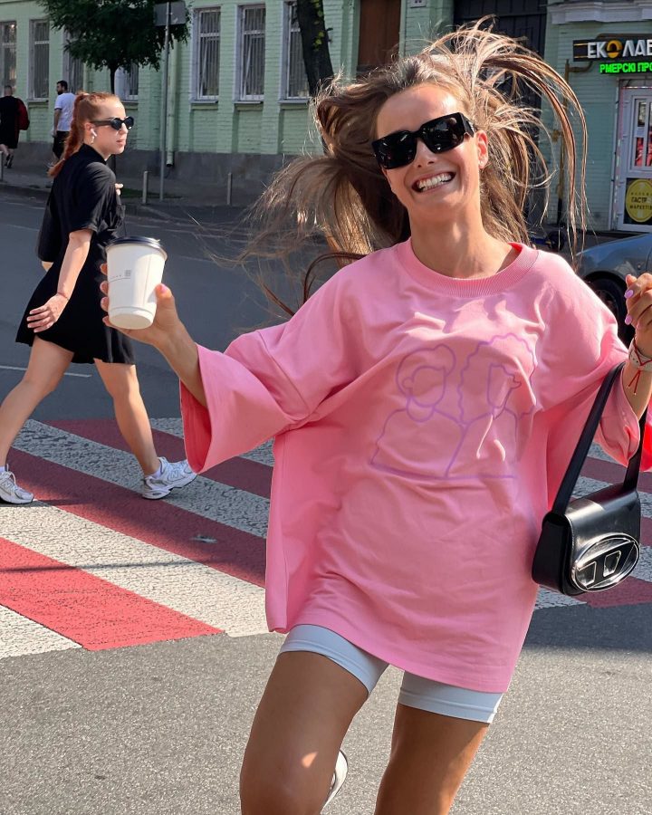 Для прогулянки містом акторка обрала світлі велосипедки та оверсайз футболку трендового рожевого кольору, а від сонця обличчя зірки захистили темні окуляри.