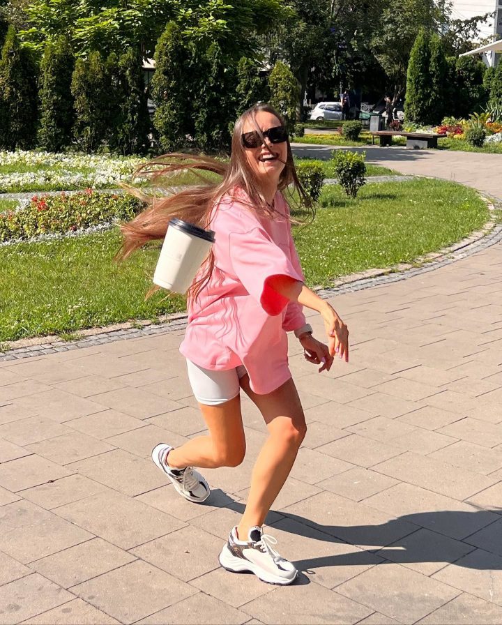 Зірка поділилася на своїй сторінці в Instagram кумедними кадрами, на яких біжить по центру столиці, веселиться та навіть жбурляє стаканчик кави у камеру.