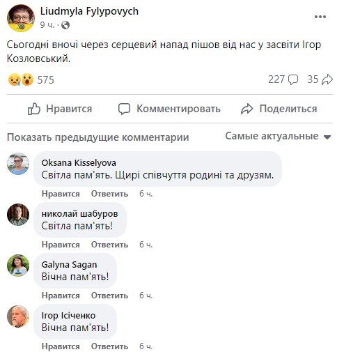 «Сьогодні вночі через серцевий напад пішов від нас у засвіти Ігор Козловський», – написала у Facebook українська філософ та релігієзнавець, професорка Києво-Могилянської академії Людмила Филипович.