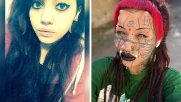 На першій світлині Керстін зображена без видимих татуювань та у значно скромнішому вбранні. А вже через 9 років її зовнішність змінилася кардинально — тепер руки, шию, тулуб та навіть чоло Керстін рясно вкривають татуювання. Також нині вона має декілька пірсингів — в носі та вухах.