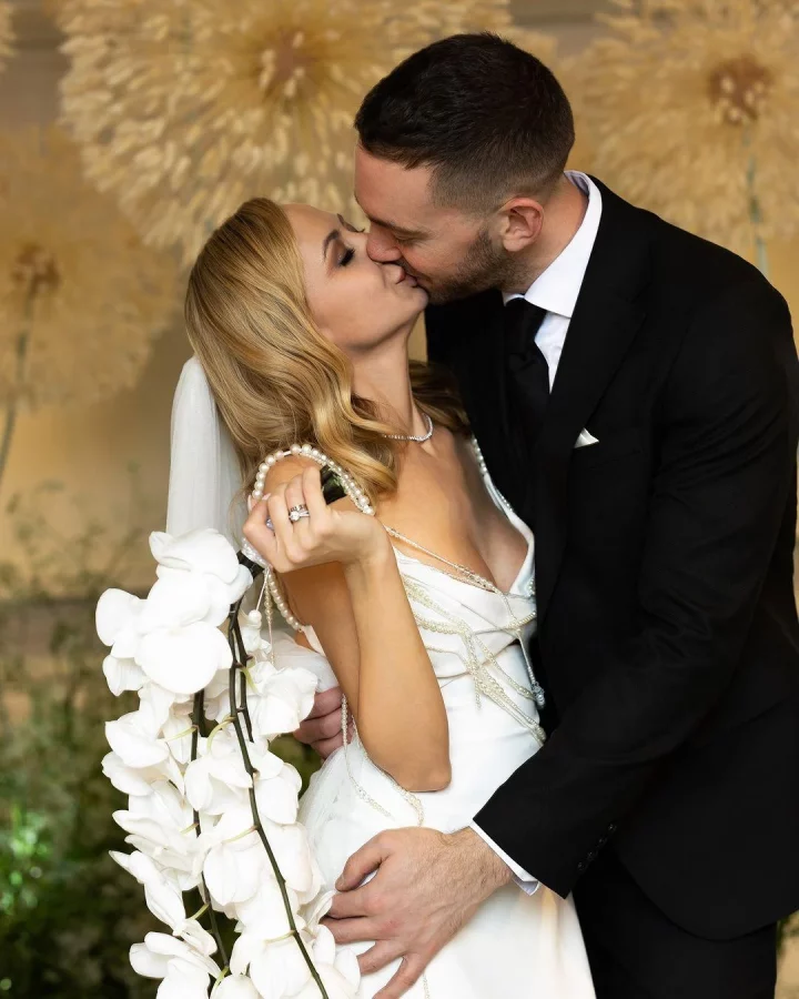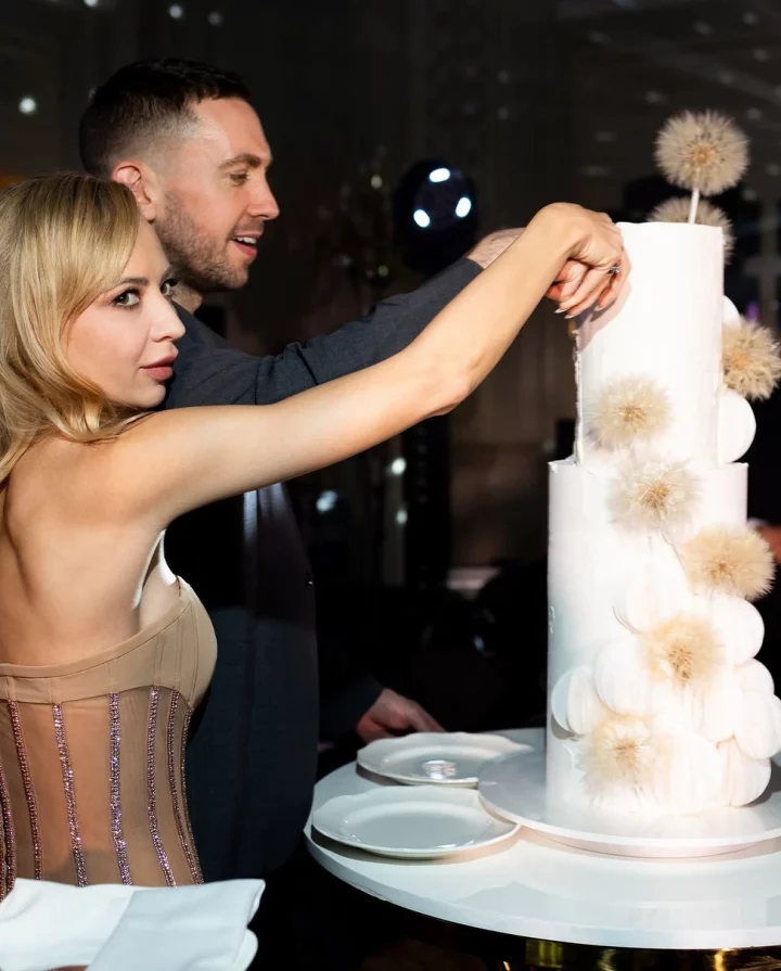 Саме весілля вирішили зіграти у столиці. Для святкування наречена обрала два луки від українських брендів: довгу білу сукню з вельйоном від Milla Nova та зухвале корсетне міні бежевого кольору від Frolov. У той же час Ріс вибрав для себе класичний чорний костюм, який доповнив бутоньєркою.
