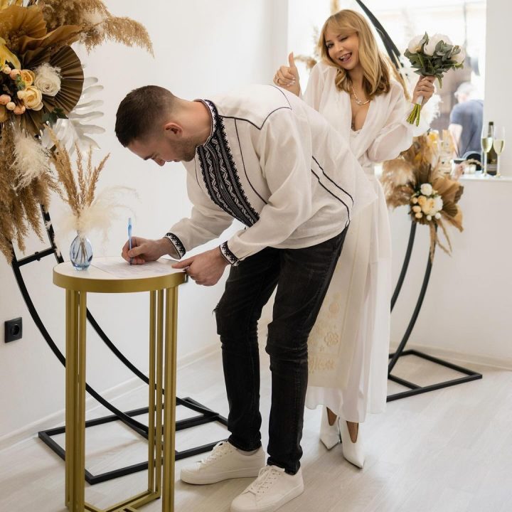 На церемонії молодята були в нарядах з національною символікою — на сукні нареченої була вишивка, а Ріс і зовсім віддав перевагу вишиванці. У РАГСі були присутні лише рідні та близькі друзі.