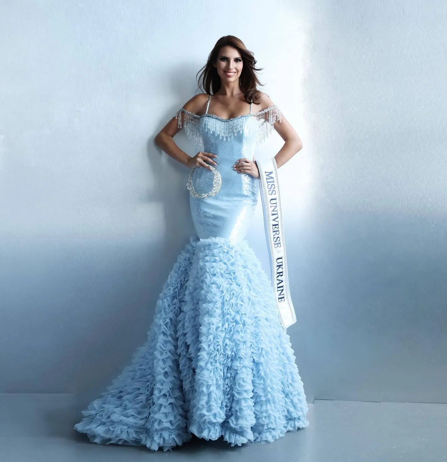 Для першої офіційної фотосесії красуні в статусі “Міс Всесвіт Україна” їй підібрали пастельний образ із розшитим блискучими камінцями корсетом і пишною спідницею.