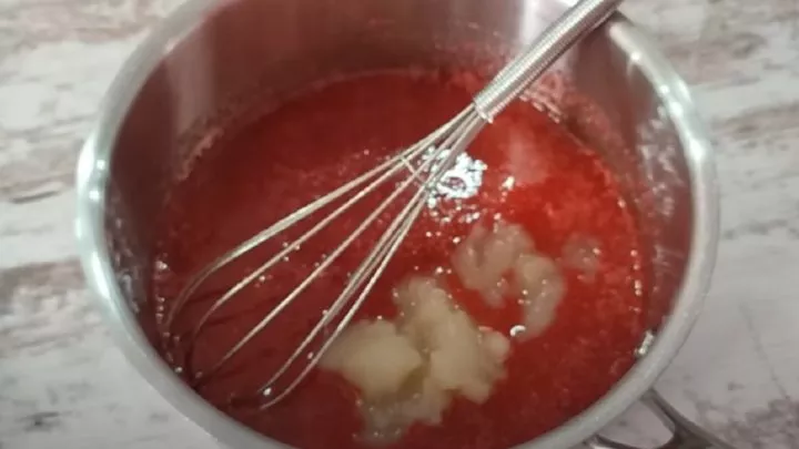 Змішайте агар-агар з водою і дайте йому набухнути близько 10 хвилин. Покладіть полуничне пюре в каструлю і змішайте з цукром і желатином.