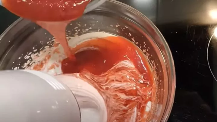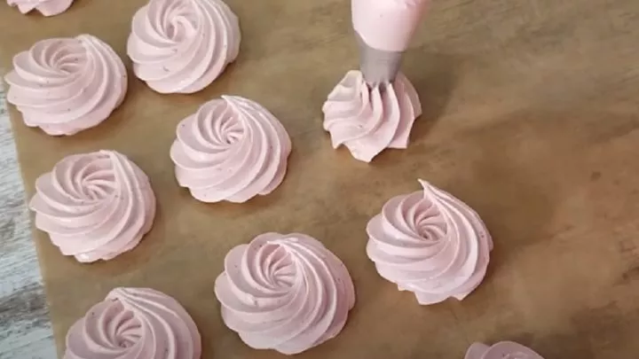 Збивайте білкову суміш протягом 2 хвилин і не припиняйте збивати навіть тоді, коли до неї додається гаряче полуничне пюре. Після додавання пюре продовжуйте збивати ще півтори хвилини і наповніть отриманою сумішшю кондитерський мішок з декоративною насадкою.