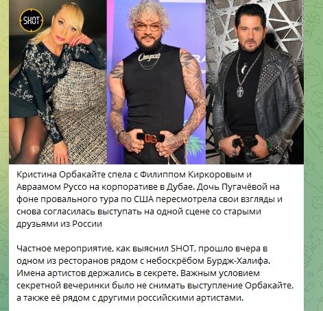 Дорогою на далекий континент артистка заглянула в Дубай, де за гонорар у 30 тисяч євро погодилася виступити на приватному корпоративі. Захід відбувся в одному з ресторанів біля знаменитого Бурдж Халіфа. Після прибуття доньку Алли Пугачової чекав неприємний сюрприз — виявилося, що серед запрошених артистів значаться Філіп Кіркоров і Авраам Руссо, які підтримали війну з Україною.