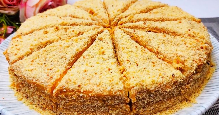 Складаю торт, перемазуючи всі коржики кремом, верх і боки також змащую. Посипаю крихтою.