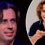 У білки всипати суміш борошна, цукру та горіхів і акуратно змішати. Розділити наше «тісто» на 2 частини і викласти у форми, застелені промасленим вершковим маслом пергаментом (форми мають бути різними за розмірами, один корж 20 см, другий 23 см). Якщо у Вас немає можливості пекти 2 коржі одразу, розділіть інгредієнти на 2 частини, збивайте і печіть по черзі.