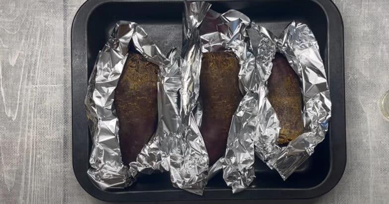 Промиваю та просушую буряк, не очищаю його. Окремо кожний кладу у фольгу, заливаю олією, щільно замотую фольгу. Викладаю на форму для випікання. Випікаю у розігрітій духовці до 200 градусів приблизно 40-50 хвилин.