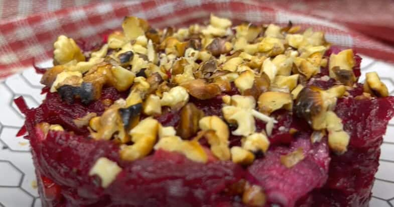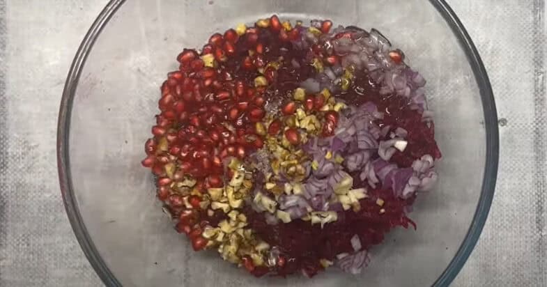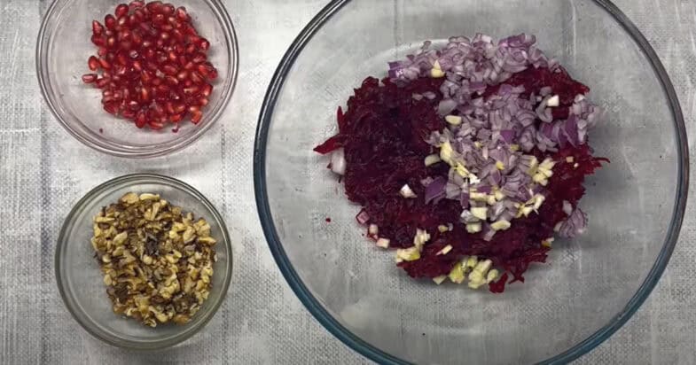 Охолоджений і очищений буряк натираю на грубій терці у мисці, додаю дрібно порізану цибулю та часник. Додаю ще підсушені і подрібнені горішки та зерна гранату, перемішую.