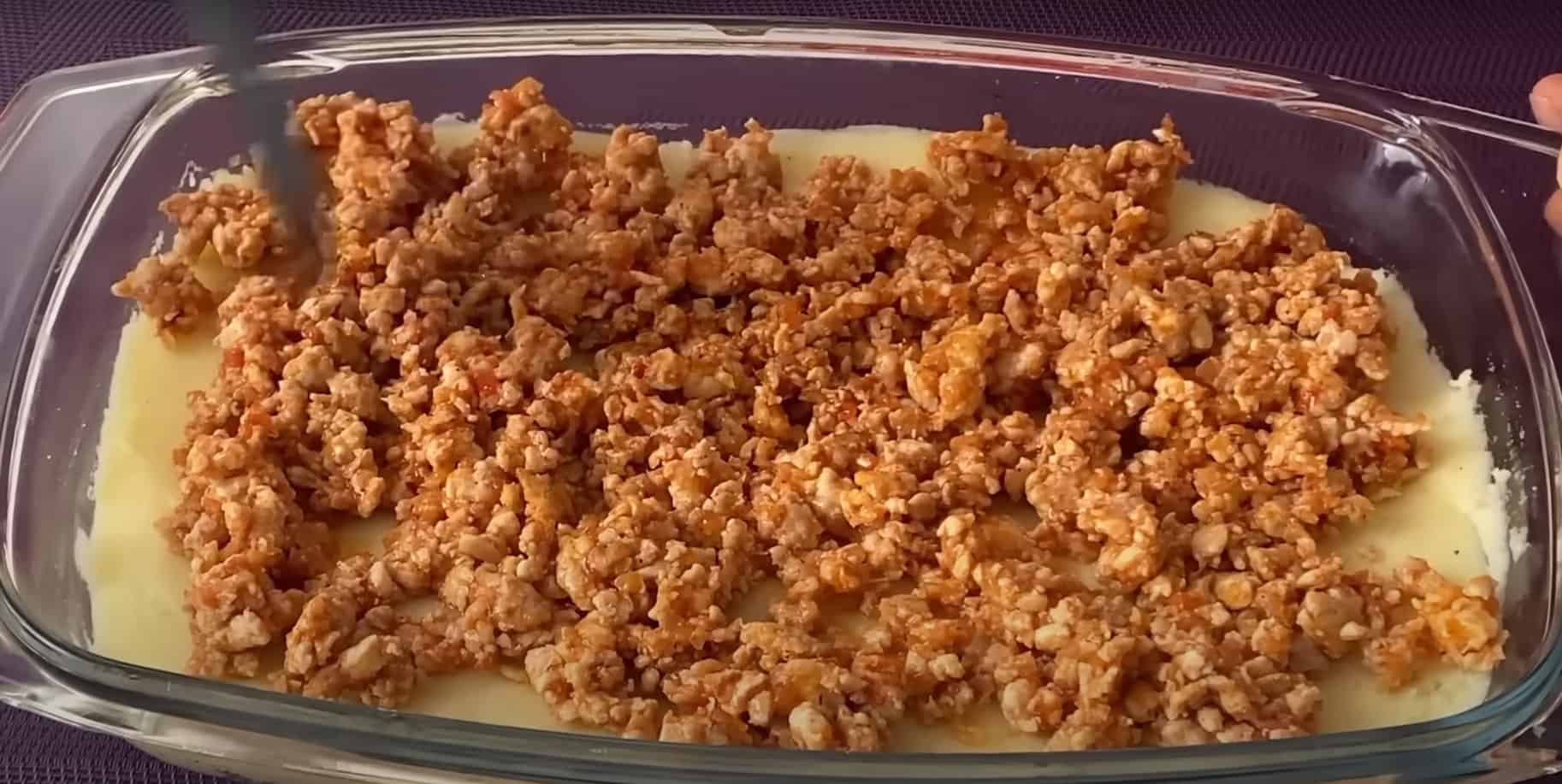 Форму для запікання змащуємо олією, ½ частину пюре викладаємо на дно і розподіляємо по поверхні. На шар із пюре кладемо обсмажений фарш, теж частину.