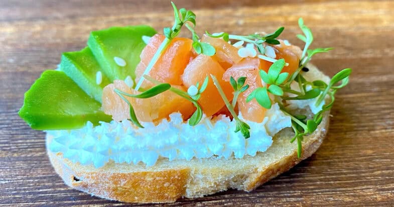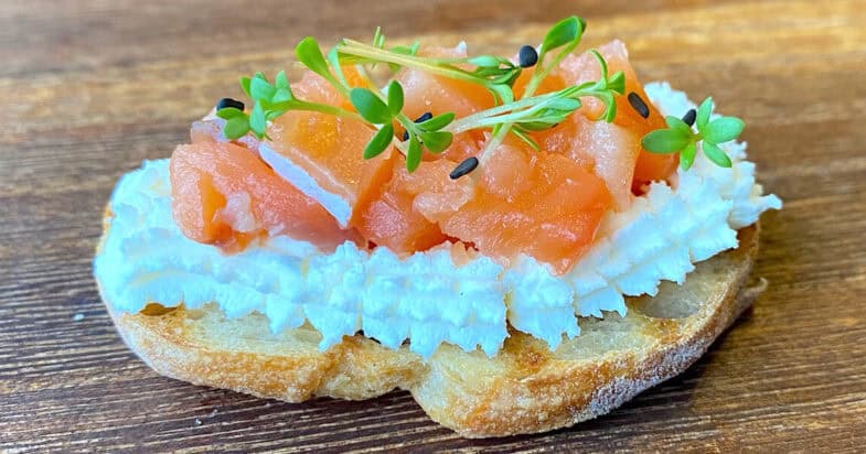 Для початку нарізаю багет на тонкі скибочки і злегка підсушую на грилі. Потім викладаю вершковий сир. Нарізаю на маленькі шматочки червону рибу холодного копчення і викладаю на сир. Прикрашаю зеленню та насінням кунжуту.