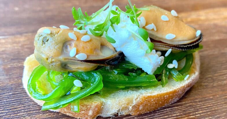 Скибочки багета натираю часником, викладаю морські водорості і копчені мідії. Посипаю кунжутом і зеленню. Можна доповнити вершковим сиром.