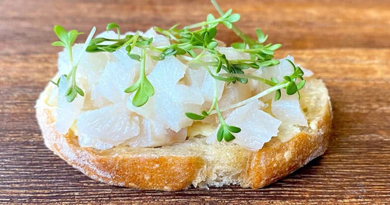 Грінки змащую тонким шаром вершкового масла. Філе палтуса нарізаю на маленькі шматочки та викладаю зверху. Прикрашаю зеленню.