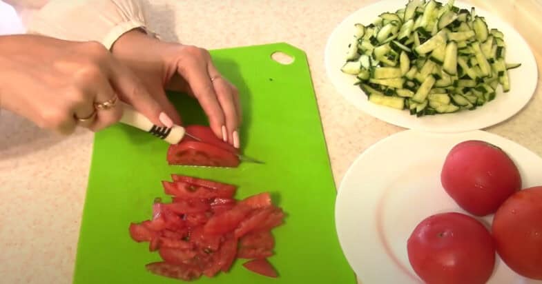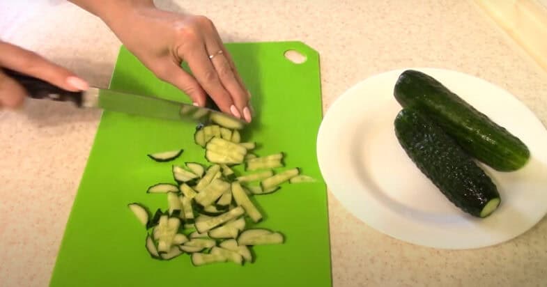 Добре промиваю, не очищаючи, нарізаю огірки півкільцями.