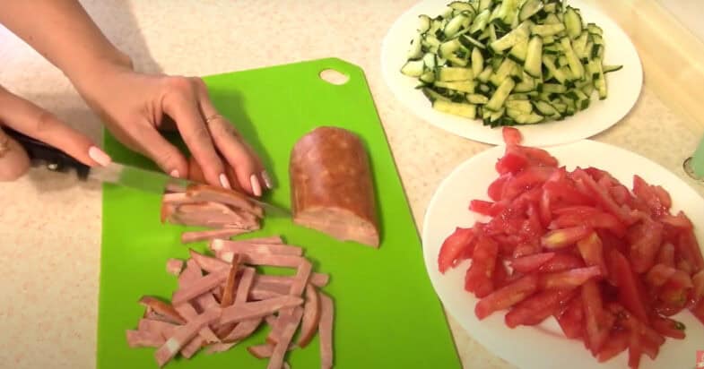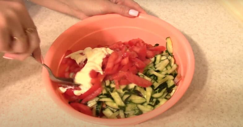 Всі нарізаю продукти кладу в глибоку миску, солю, додаю майонез та перемішую.