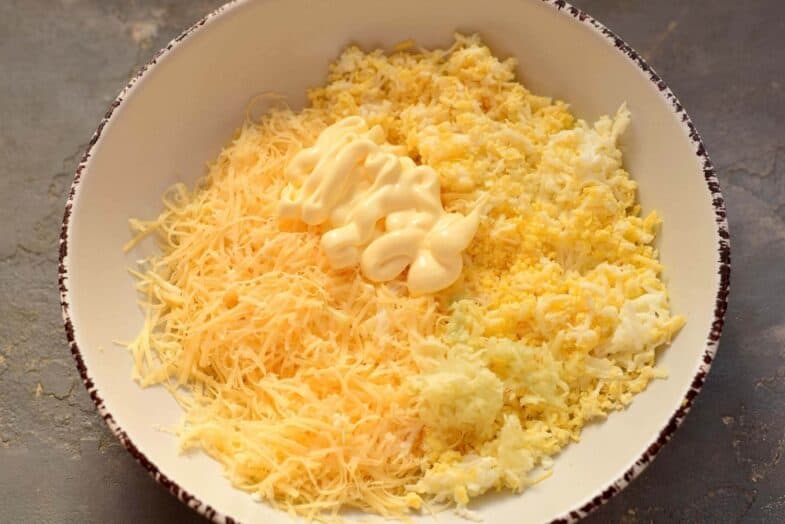 Відваріть яйця, очистіть, білок і жовток натріть на дрібній тертці. Твердий сир натріть на дрібній тертці, змішайте з яйцями. Додайте подрібнений часник, майонез, сіль та мелений перець за смаком. Усі інгредієнти ретельно перемішайте між собою, отримуючи однорідну суміш.