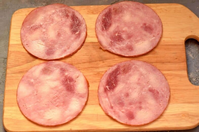 Шинку наріжте тонкими кружальцями або придбайте готову порізану.