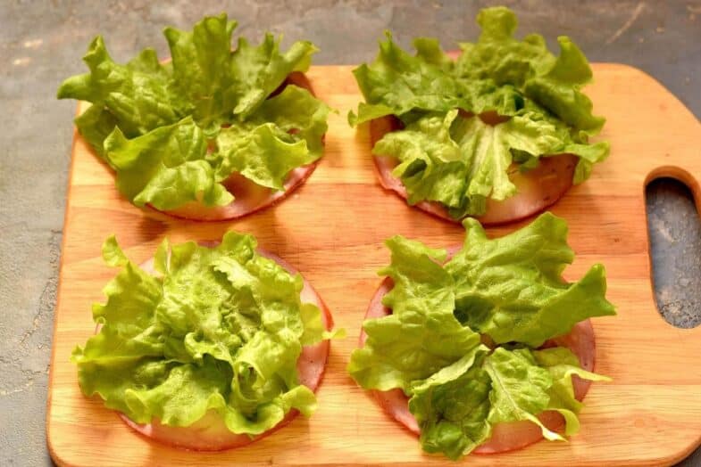 Листя салату промийте, висушіть, викладіть на шинку.