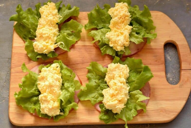 На листя салату покладіть сирно-яєчну начинку, як на фото.