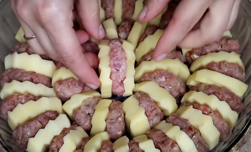 4. Викладіть картоплю та фрикадельки на деко, змащене олією, відповідно до моделі, що додається.