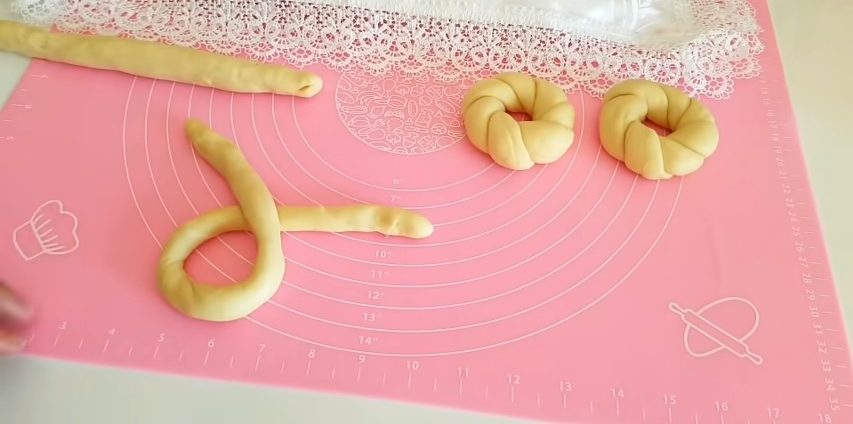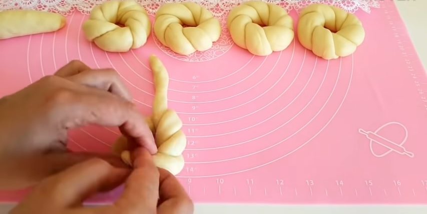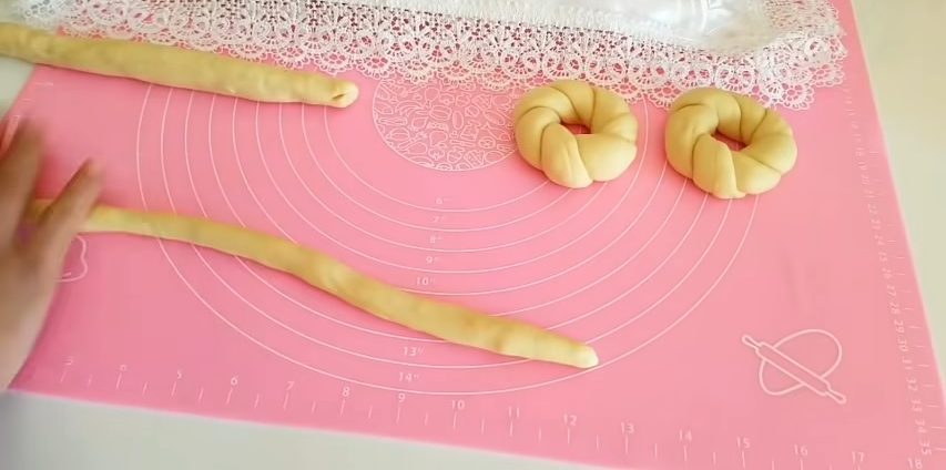 Після підйому ми ділимо тісто на 12 рівних шматочків, з яких формуємо кульки. Накрийте кульки чистим кухонним рушником, щоб вони не висохли. Беремо першу кульку, викладаємо її в круглу форму і потім розкачуємо. Розтягуємо рулет в тонку і довгу паличку і згинаємо, як показано на зображенні нижче.