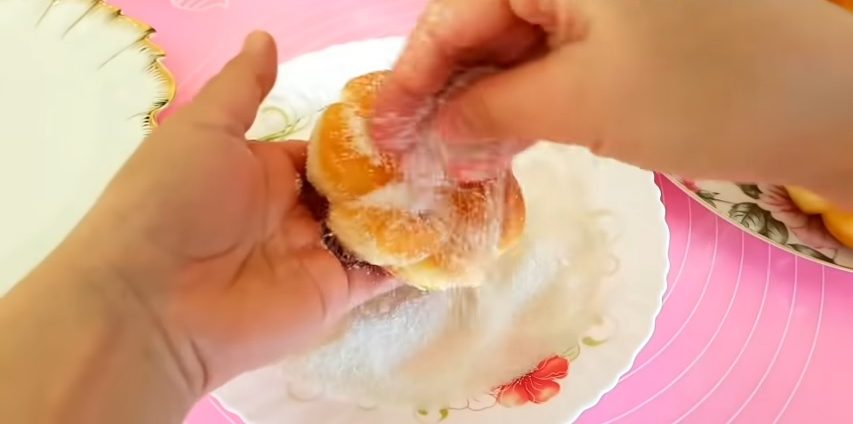 Гарячі пончики умочіть у суміш цукрової пудри та ванільного цукру (або цукрової пудри та кориці).