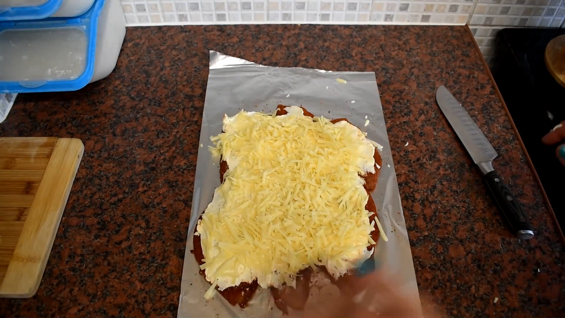 Зніміть фольгу, змастіть м’ясо вершковим сиром і зверху посипте тертим сиром. За допомогою фольги згортаємо. Загортаємо рулет у фольгу і прибираємо в холодильник на 30 хвилин.