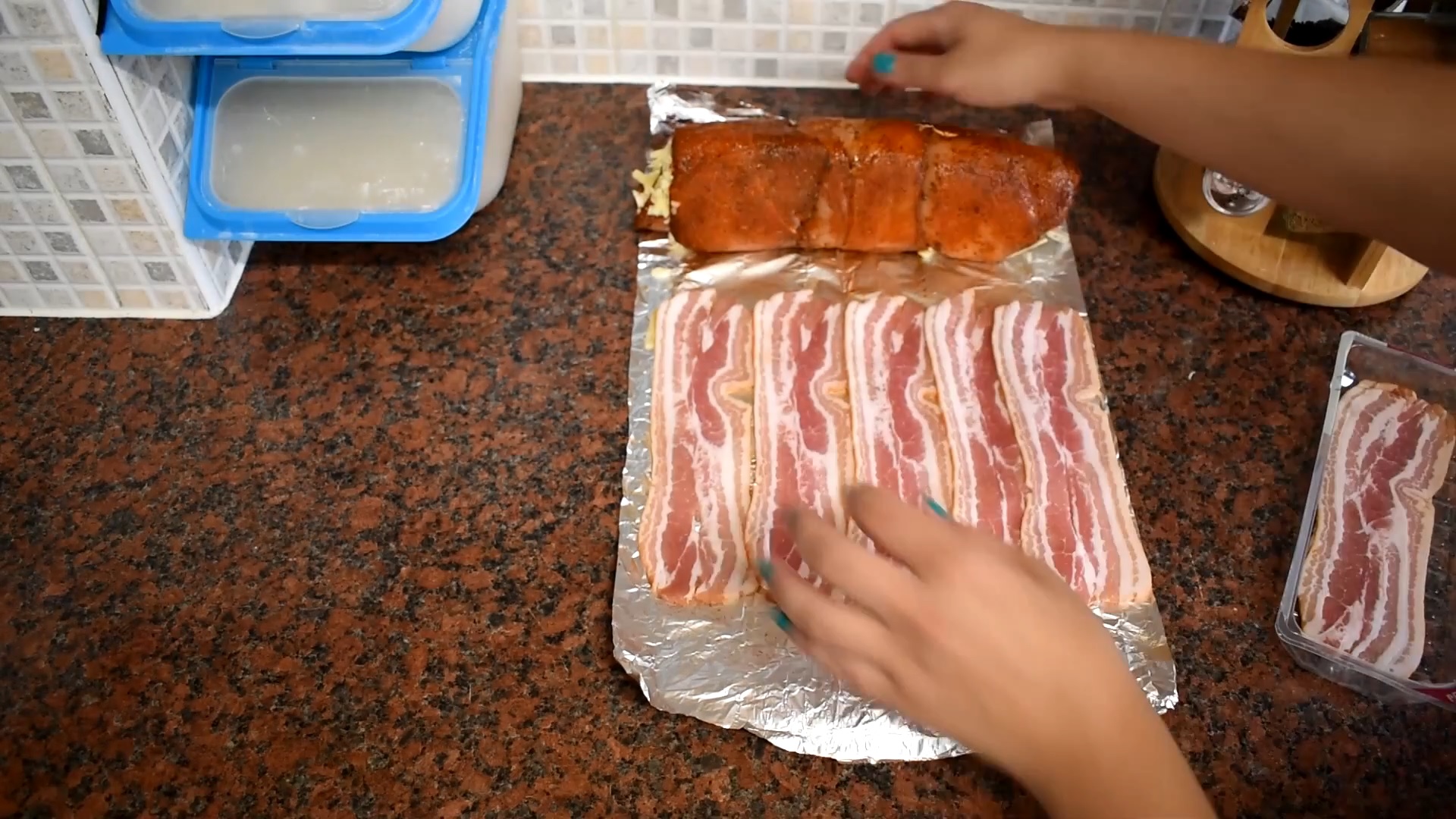 Після знімаємо фольгу і викладаємо рулет на одну сторону. Викладіть скибочки бекону на вільну поверхню фольги, як показано на зображенні нижче.