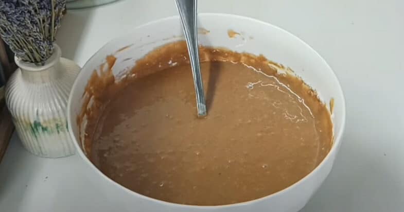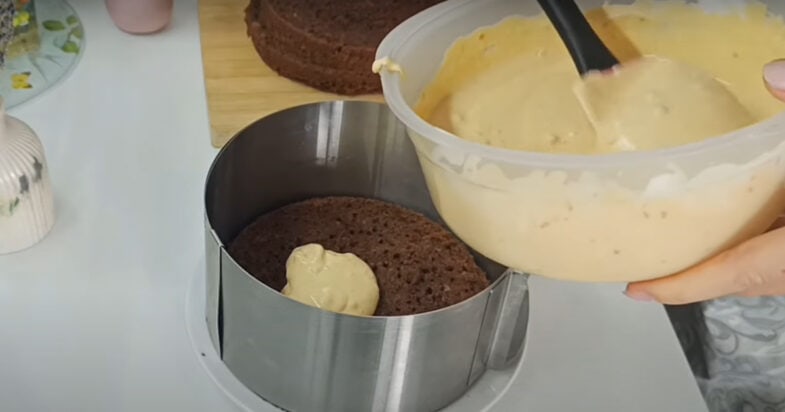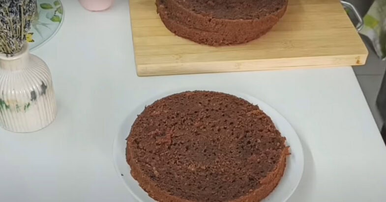 Форму діаметром 19 см застеляю пергаментом і виливаю усе тісто. Відправляю у духовку при температурі 180 градусів на 40 хвилин. Бісквіт охолоджую і розрізаю горизонтально на 3 частини.