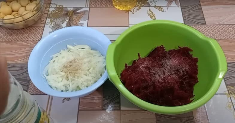 Цибулю нарізаю півкільцями, солю, перчу, додаю цукор і вливаю оцет, добре перемішую. Варений буряк натираю на терці, також солю, перчу, додаю цукор і вливаю оцет, добре перемішую. Залишаю маринуватись і цибулю і буряк на 5 хвилин.