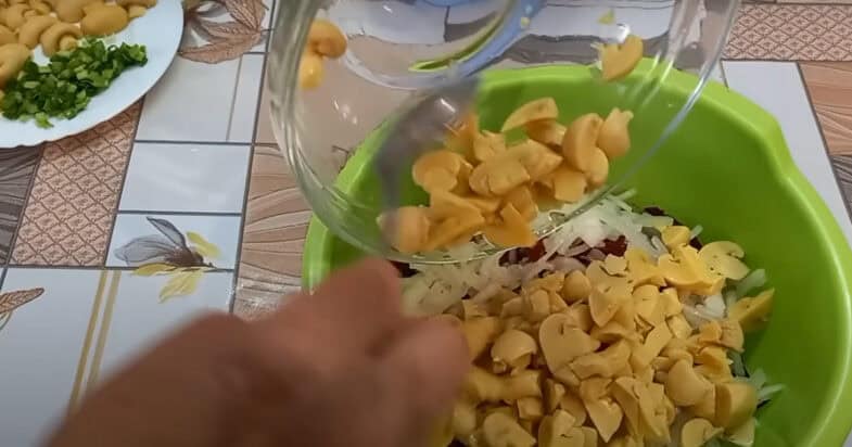 Прикрашаю салат грибами та зеленою цибулькою, смачного!