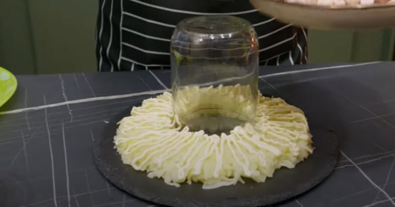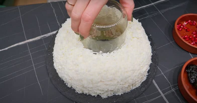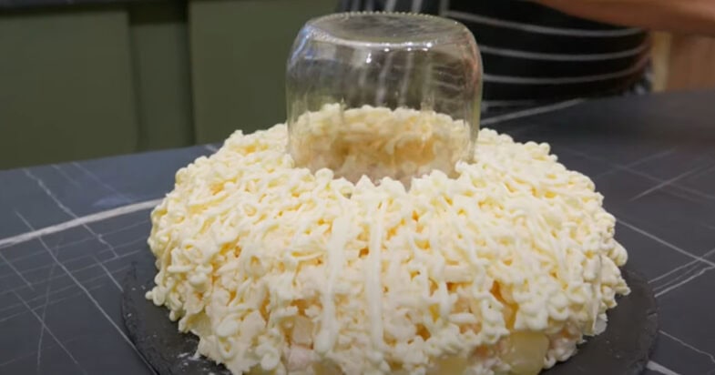 На плоску тарілку для подачі по середині ставлю склянку чи банку. Першим шаром салату натираю на терці відварену картоплю, солю, поливаю сіточкою із майонезу.