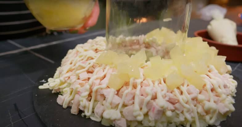 Далі відварена курка порізана соломкою, поливаю сіточкою із майонезу. Тоді ананаси порізані кубиками.
