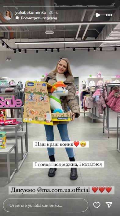 «Це перше Різдво синочка, і магія свята має бути обов’язково. А кому робити магію – нам, дорослим! Тому лечу за подаруночком. Ось такий коник їде до Оскара на Різдво. І гойдатися можна, і кататися«, — розповіла Юлія.