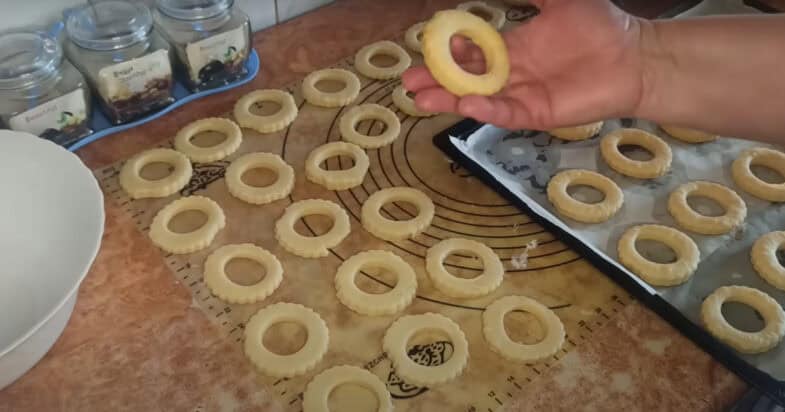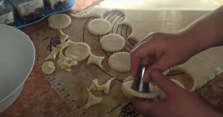 Тісто розкачую у пласт, нарізаю кружечки і дірочки всередині кружечків.